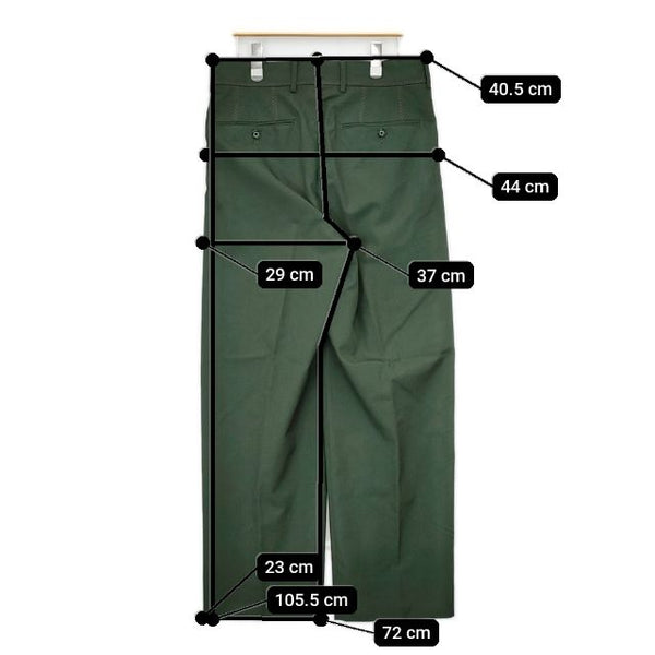 総丈:約105.5cm ウエスト:約40.5cm 股上:約37cm 股下:約72cm ヒップ:約44cm ワタリ幅:約29cm 裾幅:約23cm ※採寸画像がある商品はハンガーに吊るした状態での計測のため、平置きでの採寸とは差が生じる場合がございます。平置きでの実寸サイズをご希望の場合は、ご購入前に必ずご質問ください。