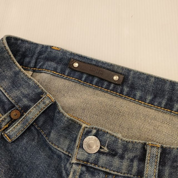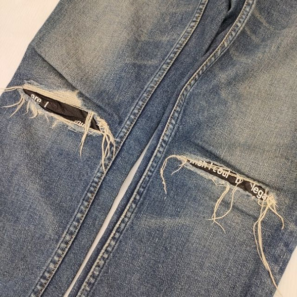 デニムパンツ ニークラッシュデニムパンツ レザーパッチ加工 ジーンズ ダメージ加工 2011-1002-86-302 |